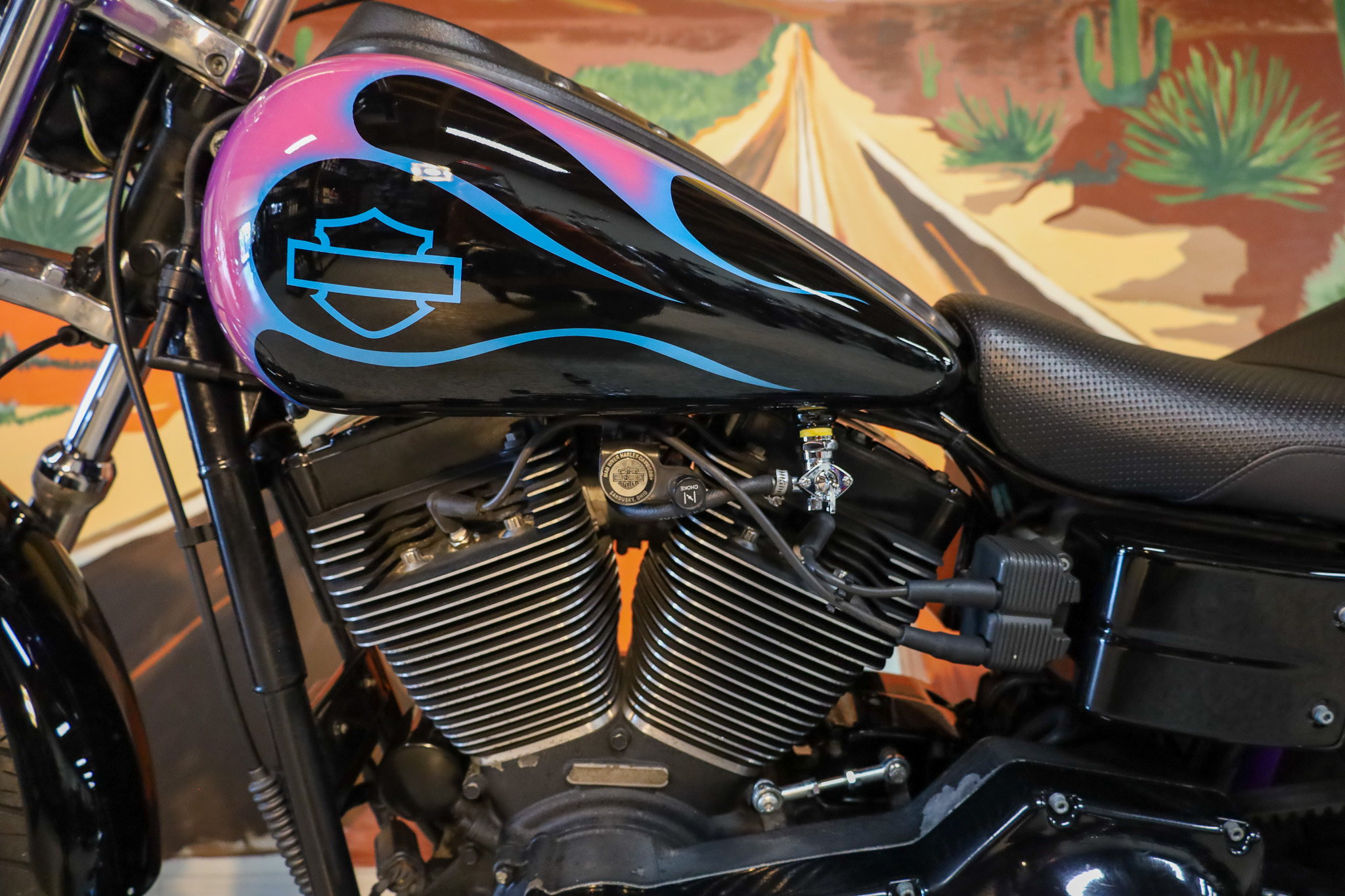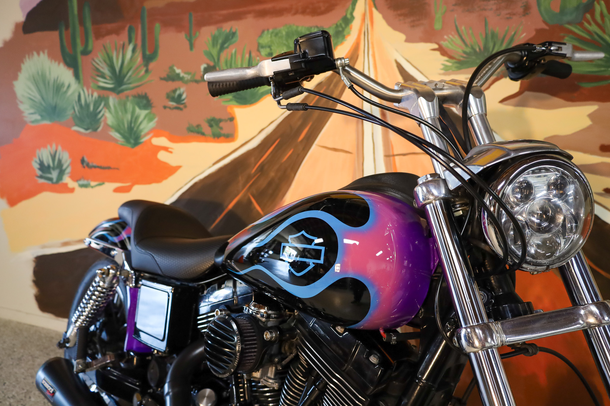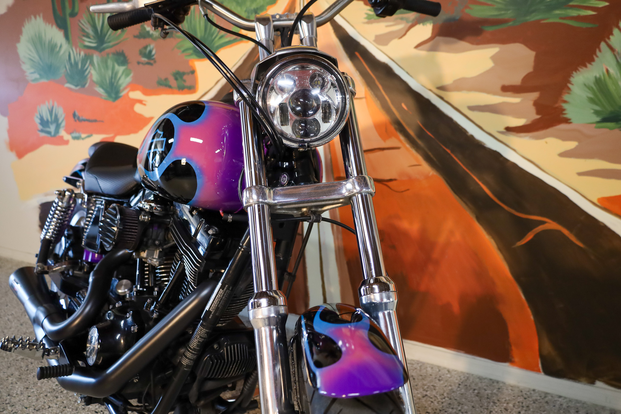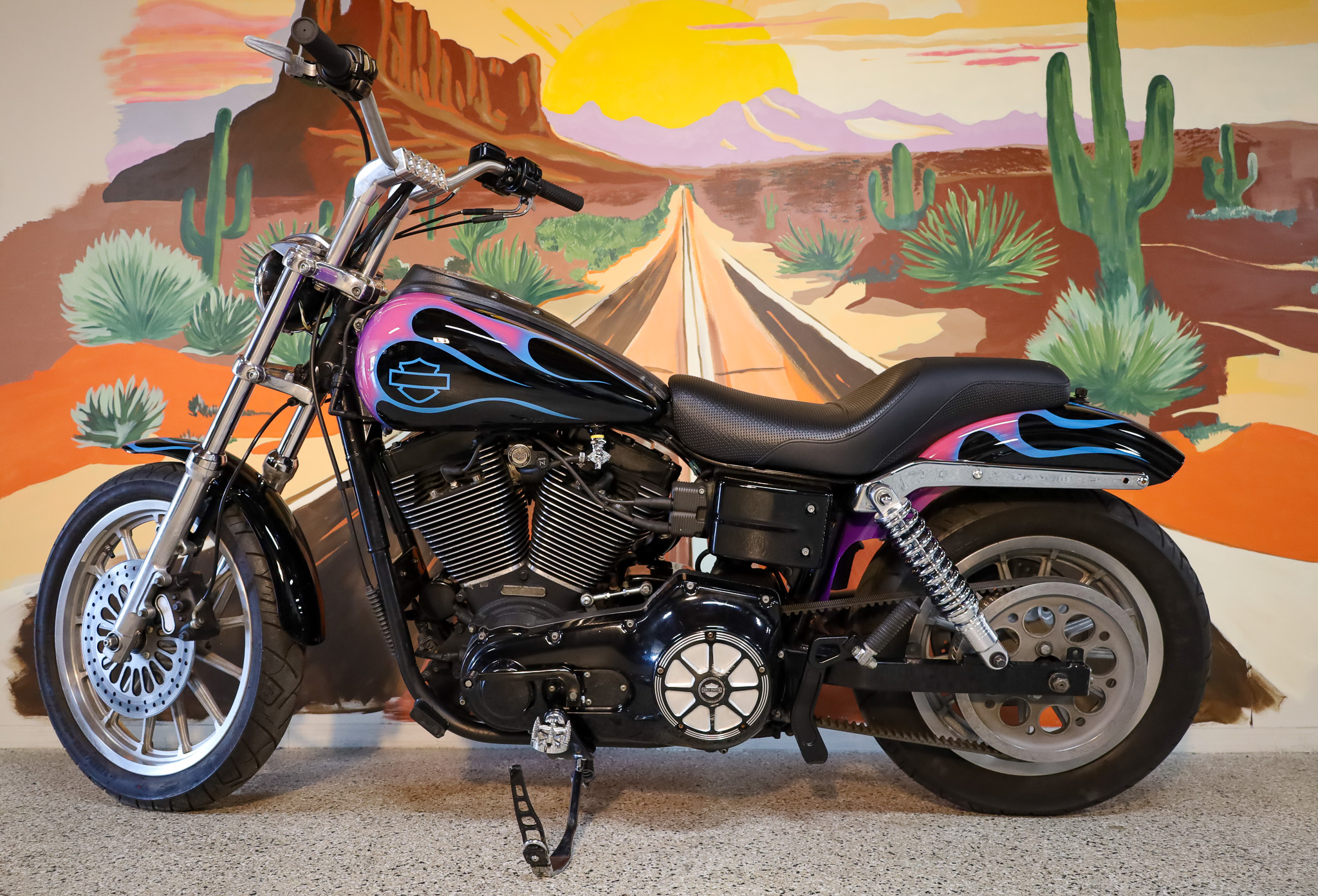 This blacked out 2004 Dyna Super Glide turns heads with its custom purple, blue, and pink flame paint that pops against the classic Harley lines. Outfitted with performance and style upgrades, it’s running a Bassani Ripper exhaust that gives it a raw, aggressive tone. Dialed in with TC Bros pullback risers and Thrashin Supply handlebars, delivering a comfortable yet commanding riding position. A perfect blend of old-school Dyna soul and modern aftermarket attitude, this bike is built to ride hard and look good doing it.